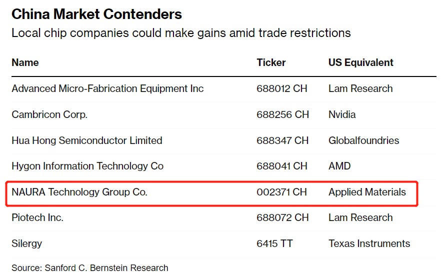 來自巴克萊銀行 (Barclays) 和伯恩斯坦公司 (Sanford C. Bernstein) 的分析師們表示,Naura Technology Group(北方華創) 等半導體設備公司的名字有一天可能將與應用材料以及泛林集團 (LAM Research) 等美國半導體設備同行一樣聞名全球。其中,伯恩斯坦分析師們將北方華創直接對標半導體設備巨頭應用材料 (Applied Materials)。