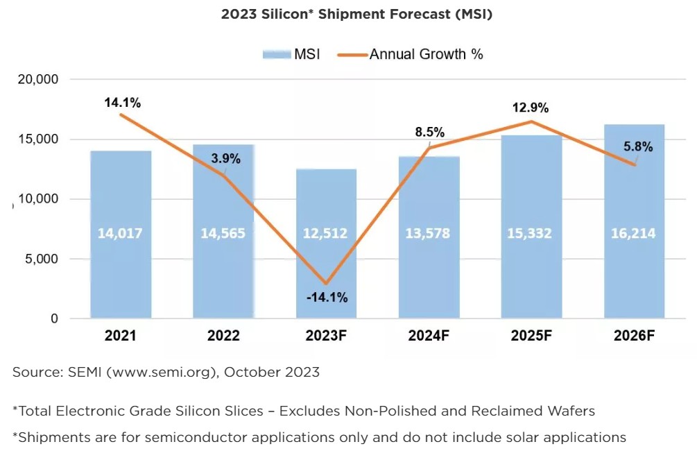 SEMI(國際半導體產業協會) 在最新公佈的年度硅出貨量預測報告中指出,隨着硅晶圓和整個半導體行業需求復甦和庫存水平正常化,以及硅晶圓需求大幅增加以支持人工智能 (AI)、高性能計算 (HPC)、5G、汽車和工業應用等領域,全球硅晶圓出貨量將在 2024 年全面反彈,2025 年有望更加強勁。SEMI 硅晶圓數據包括硅晶圓製造商發往最終用户的拋光硅晶圓和外延硅晶圓,不包括未拋光或回收的晶圓。這些硅晶圓將被送至台積電等芯片製造商處進行精細加工,通過極其複雜的製造過程在硅晶圓上製成集成電路 (ICs)。