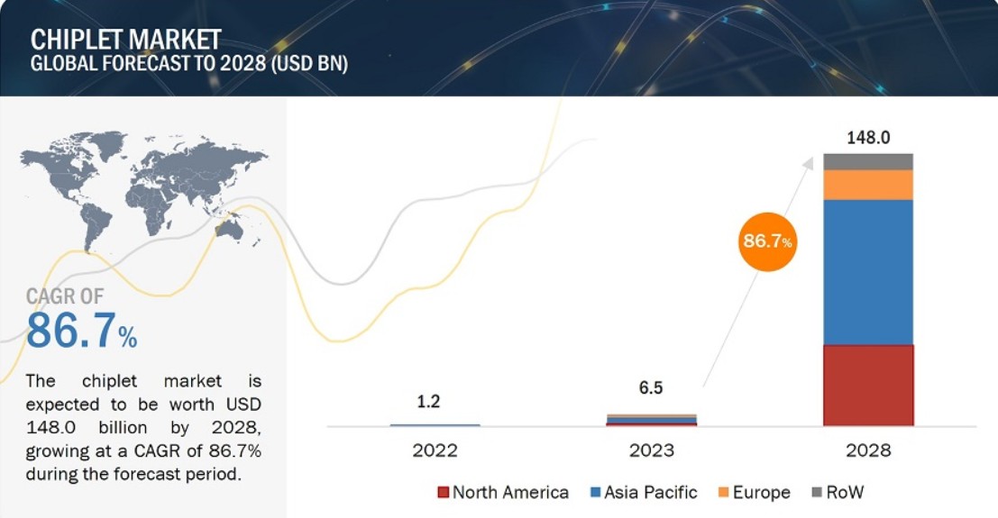 IDC 預計至 2024 下半年,台積電 CoWoS 產能有望大幅增加約 130% 。另一研究機構 Markets And Markets 最新研究顯示,覆蓋 GPU、CPU、FPGA 等芯片的 Chiplet 先進封裝成品、先進封裝技術 (2.5D/3D、SiP、WLCSP、FCBGA 和 Fan-Out 等) 的 Chiplet 市場總額有望於 2028 年達到約 1480 億美元,年複合增速 (CAGR) 高達驚人的 86.7%。根據該機構測算,2023 年 Chiplet 市場總額可能僅為 65 億美元。