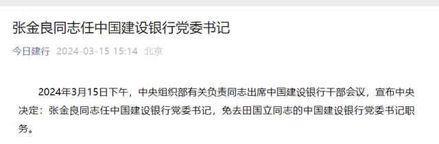 3 月 15 日,建設銀行發佈公告,當日下午,中央組織部有關負責同志出席中國建設銀行幹部會議,宣佈中央決定:張金良同志任中國建設銀行黨委書記,免去田國立同志的中國建設銀行黨委書記職務。