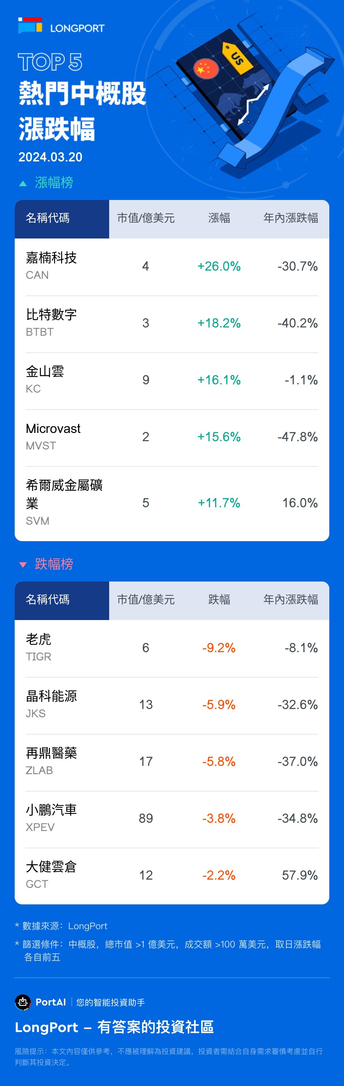 嘉楠科技 (CAN) 涨 25.98%,成交额 4129.8 万美元,年内累计跌 30.7%。 比特數字 (BTBT) 涨 18.22%,成交额 3021.8 万美元,年内累计跌 40.2%。 老虎 (TIGR) 跌 9.17%,成交额 1649.8 万美元,年内累计跌 8.1%。 晶科能源 (JKS) 跌 5.86%,成交额 5530.1 万美元,年内累计跌 32.6%。