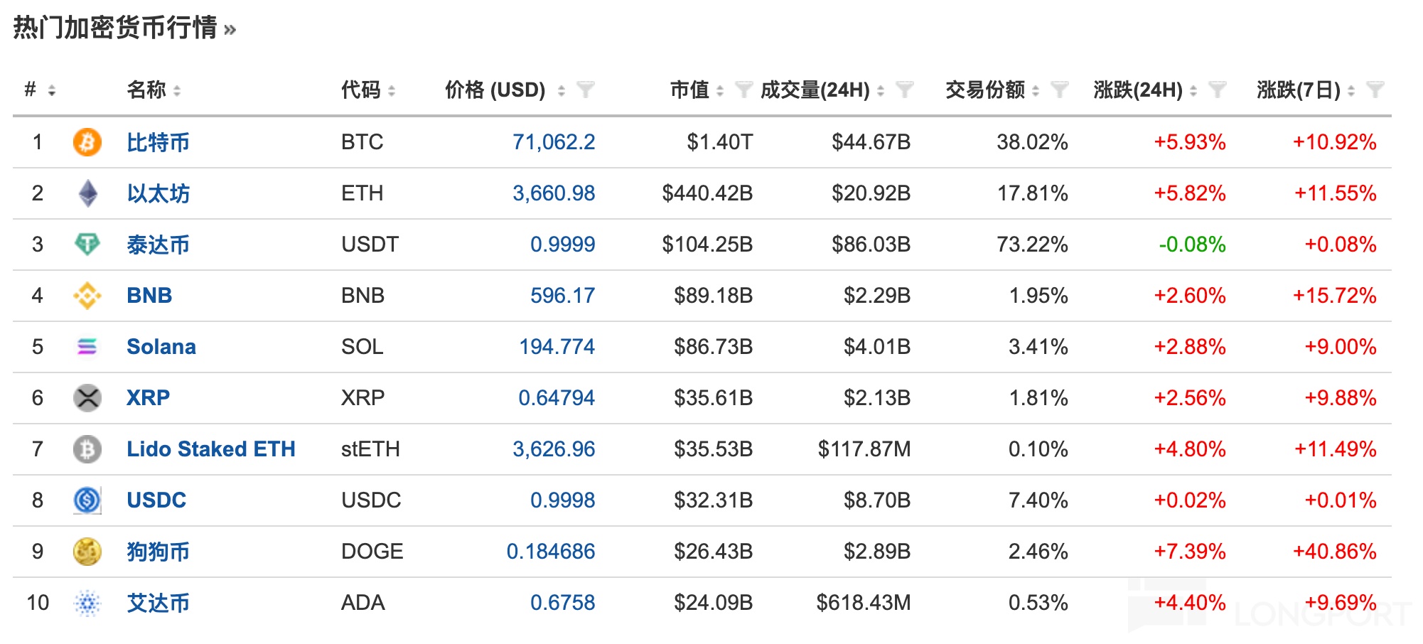 比特幣現報 71062 美元,24 小時漲 6%;以太坊現報 3660 美元,24 小時漲近 6%。