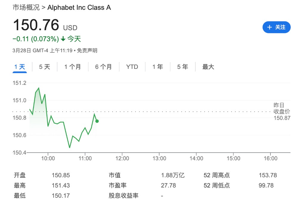 谷歌母公司 Alphabet A 股股價週四盤中下跌 0.07%,報 150.76 美元。