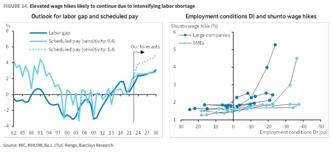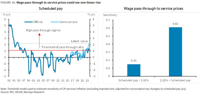 此外,在日央行長期關注的工資/通脹循環方面,巴克萊預計今年的最終工資增幅將達到 4.6%,並還有上行可能,當整體名義工資漲幅超過 1.11% 的臨界點,服務通脹將會出現非線性上升(上升幅度會更大)。