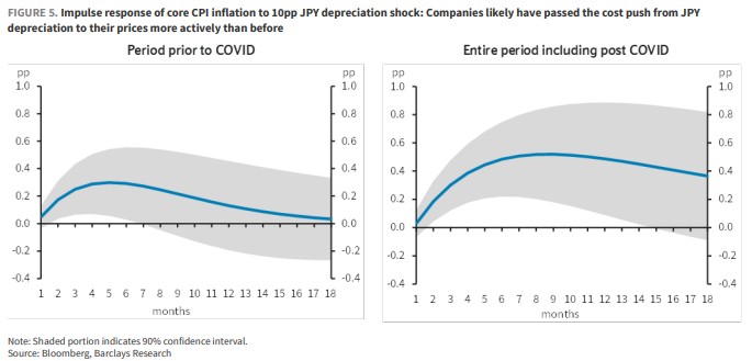在新冠疫情之前,10% 的日元貶值對核心 CPI 通脹的影響在 5 個月後達到約 0.3% 的峯值,在 6 個月後統計意義上的影響消失。