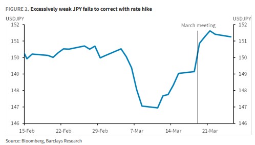 巴克萊表示,日元過度疲軟的態勢將持續成為日央行關注的焦點。自日央行在 3 月利率會議上宣佈加息以來,日元已持續貶值至 34 年低點。