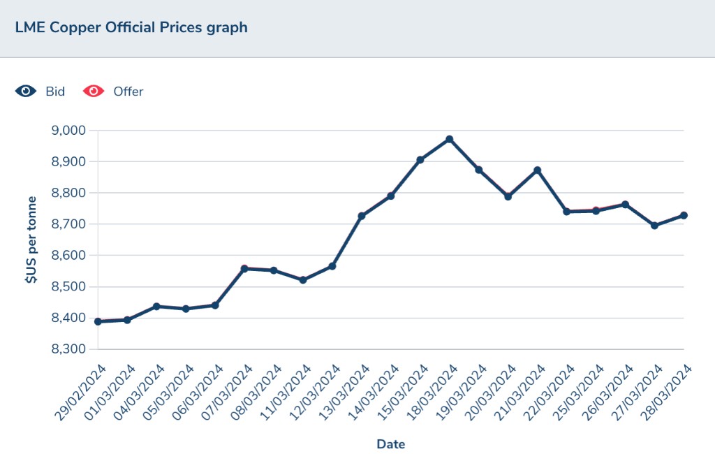 3 月份以來全球銅價持續走高,3 月 16 日,國際銅價(LME 銅)一度上破至 9000 美元/噸關口;截至當前,國際銅價依然超過 8700 美元/噸。
