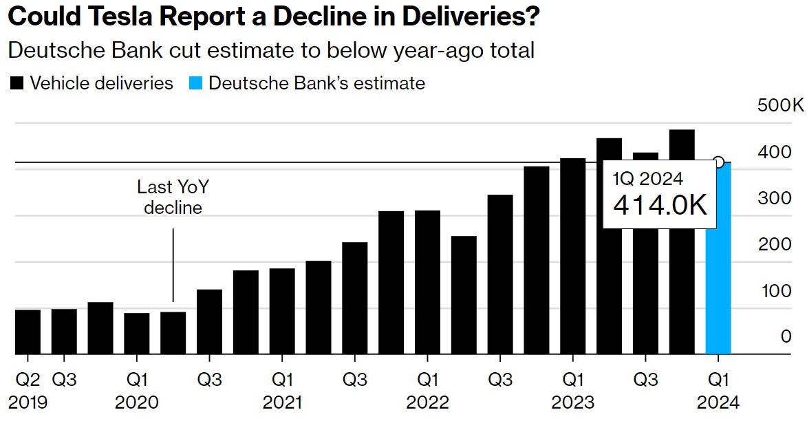 特斯拉可能迎來首個 “壞消息”。由於電動汽車需求下降和利率上升,特斯拉的銷量受到影響。分析師們下調了本週交貨報告的預期,預計特斯拉本季度交付量將下降 7% 以上。特斯拉宣佈將向美國客户提供一個月的免費試用,以吸引消費者。此外,特斯拉還加大了在社交媒體服務 X 上的廣告投放力度。分析師擔心,特斯拉對今年增長率的預期可能表現為第一季度根本沒有增長。這些情況使華爾街擔心特斯拉的交付量。