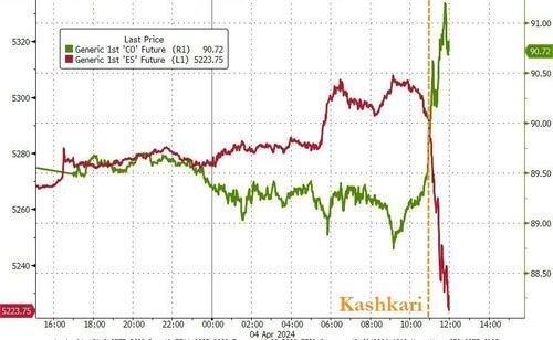 週四 4 月 4 日,標普 500 指數高開,北京時間週五凌晨 2 點卡什卡利開始講話之前持續地在 5240 點上方高位窄幅震盪,最高觸及 5256.59 點。卡什卡利鷹派講話後,美股行情急轉直下,在收盤前 20 分鐘內跌至日低 5146.06 點,最終收於這一點位附近。