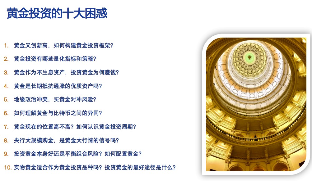 百億黃金基金經理許之彥分享華安基金黃金量化投資模型課程。最近金價創歷史新高,引發人們對黃金投資的關注。許之彥介紹了黃金投資的核心問題和市場格局的變化,幫助大家構建黃金投資組合。此外,他還提到了美元走強、美國黃金 ETF 持倉下降和美國實際利率上行等傳統黃金分析框架的失效。通過這次課程,投資者可以更好地理解黃金投資的關鍵因素和未來金價的走勢。
