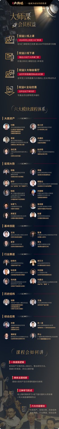 自 2017 年以來,華爾街見聞大師課團隊邀請眾多一線金融大咖、新財富白金分析師、首席經濟學家、首席分析師、百億基金經理擔任授課導師,已精心打造出 50 多門《見聞大師課》課程並廣受市場好評,成為了財經圈 “現象級” 的爆款課程,目前 50 多門課程共有超過 1000 節視頻課可供線上觀看學習。如對往期《大師課》課程感興趣的朋友,可點擊下面海報瞭解詳情。