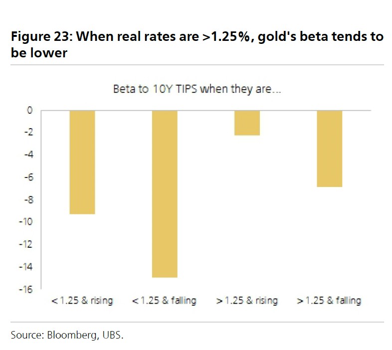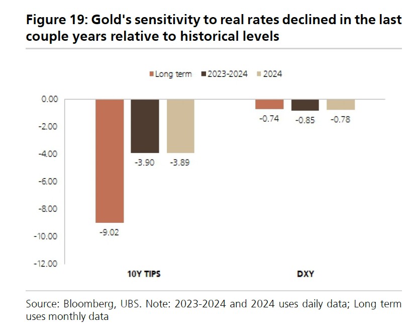 瑞银认为,这些关系从长期来看仍然成立,美国实际利率代表持有黄金的机会成本,而美元是黄金定价的主要货币,因此存在内在的负相关性。