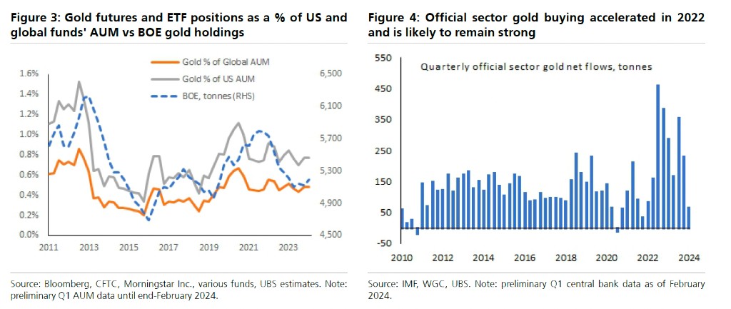 4 月 8 日,瑞银分析师 Joni Teves 和 Elena Amoruso 发布报告称,目前很难确定单一的黄金主要买盘来源,买盘较为分散,一方面黄金市场的多头头寸显著上升,但距离历史高位仍有距离,全球实物黄金 ETF 持续呈现出流出趋势,另一方面,央行在黄金上涨的过程中积极购入,但对多数央行来说,黄金占总储备的比例仍然很低,央行购金需求仍有继续上涨的空间。