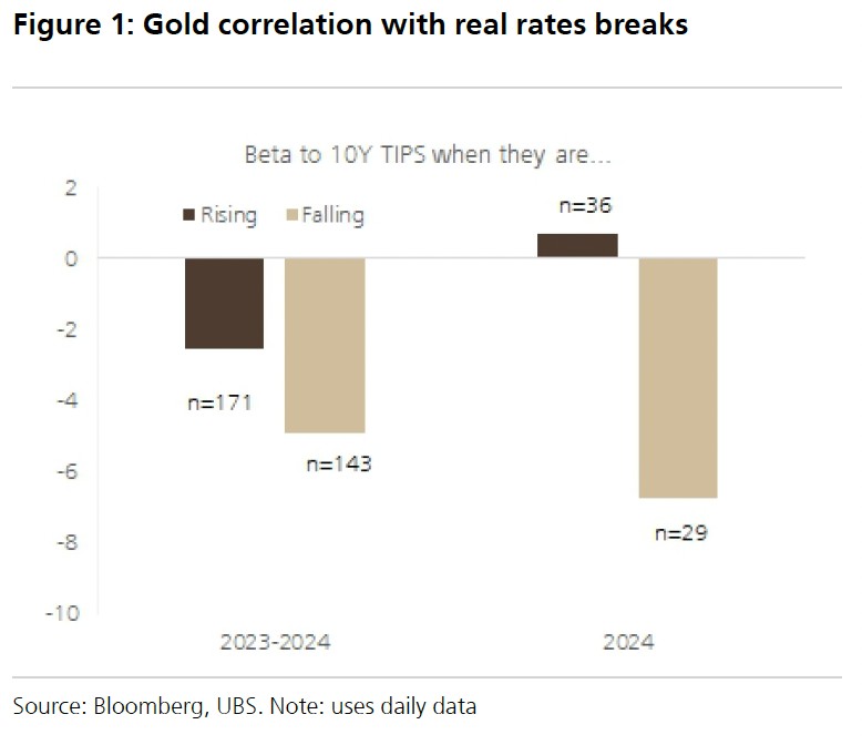 瑞银此前指出,如下图所示,模型结果显示,最近黄金的走势完全 “背离” 实际利率趋势,今年以来实际利率下降时,黄金价格和 10 年期美国通胀保值国债 (TIPS,实际利率) 间的贝塔系数为负;但在实际利率上升时,这一系数却转为正值,这与传统的理解 (即实际利率上升导致黄金价格下跌) 相悖。