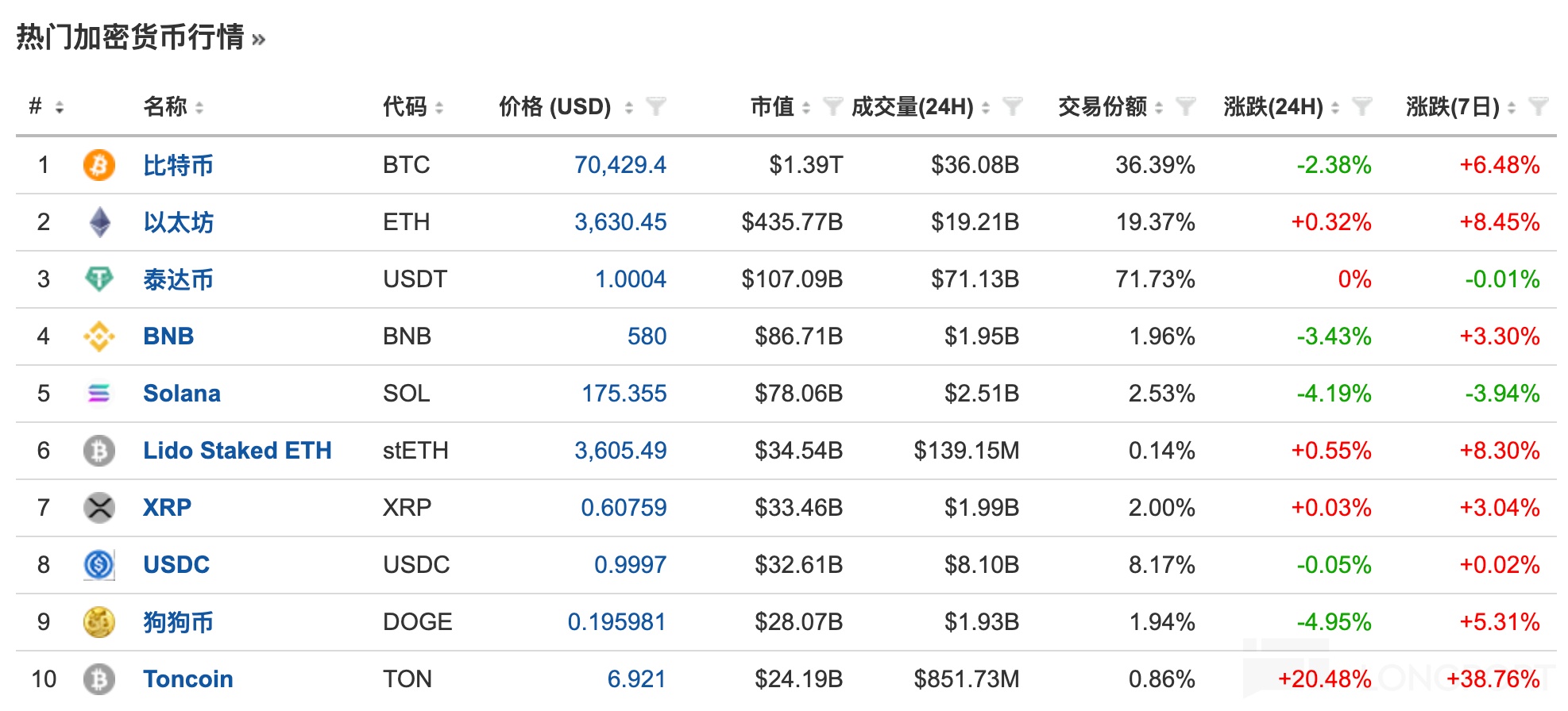比特币现报 70429 美元,24 小时跌超 2%;以太坊现报 3630 美元,24 小时微涨。