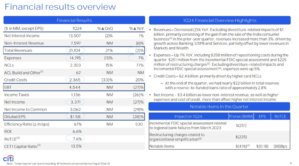 投資者一直密切關注花旗集團的收益情況,因為首席執行官 Jane Fraser 正在執行一項涉及裁減 20,000 個職位的公司重組計劃。花旗表示,到第一季度末已經裁減了 7,000 個職位。花旗首席財務官 Mark Mason 在財報電話會議中説:“我們仍在努力消除滯留成本。在接下來的幾年裏,我們還期望提高效率。”