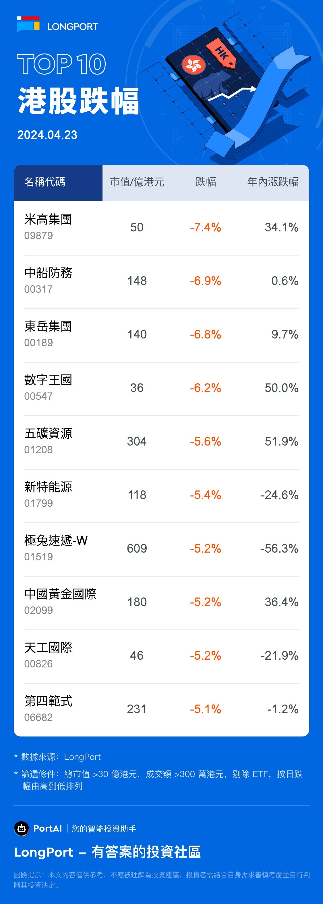 米高集團 (09879) 跌 7.45%,成交额 800.3 万港元,年内累计涨 34.1%。 中船防務 (00317) 跌 6.93%,成交额 3055.8 万港元,年内累计涨 0.6%。 東岳集團 (00189) 跌 6.77%,成交额 1.5 亿港元,年内累计涨 9.7%。