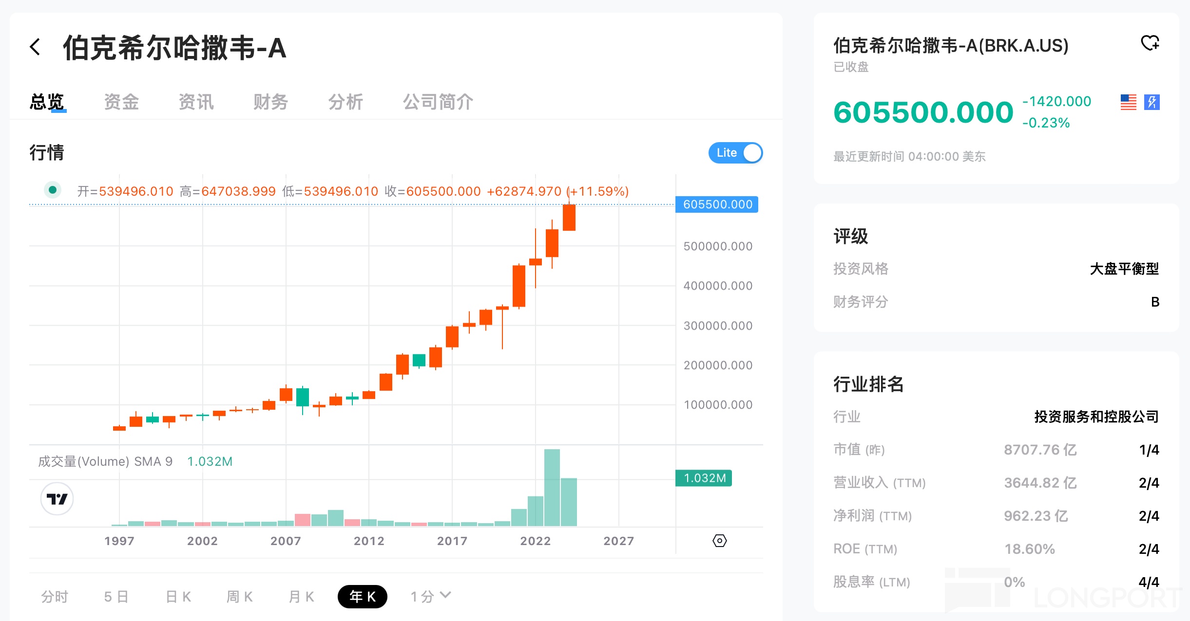 連續 9 年上漲的伯克希爾 A 類股,目前股價超過了 60 萬美元,是世界上單價最高的股票:
