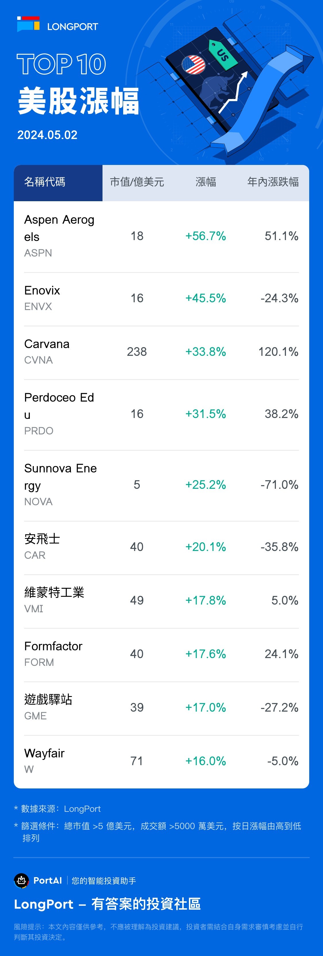 Aspen Aerogels(ASPN) 涨 56.7%,成交额 2.7 亿美元,年内累计涨 51.1%。 Enovix(ENVX) 涨 45.55%,成交额 2.3 亿美元,年内累计跌 24.3%。 Carvana(CVNA) 涨 33.77%,成交额 28.4 亿美元,年内累计涨 120.1%。