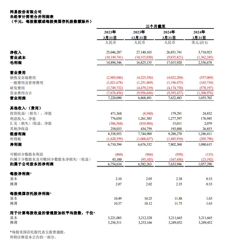 NetEase's first-quarter revenue increased by 7.2% year-on-year, with a 13% year-on-year increase in net profit|Financial Report Insights