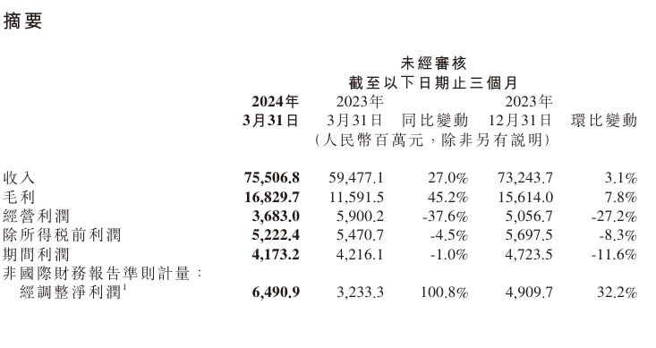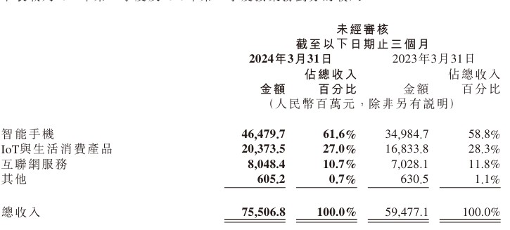 5 月 23 日週四港股盤後,小米集團公佈截至 2024 年 3 月 31 日止的一季度業績。