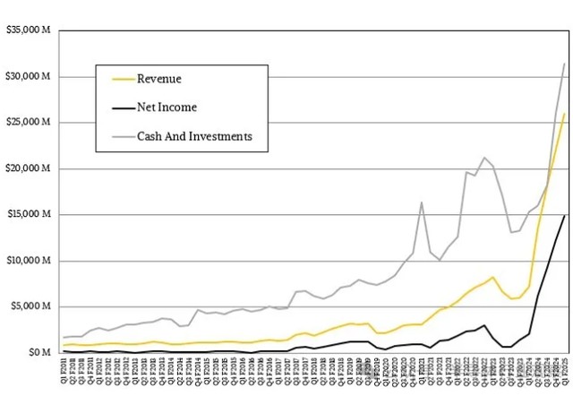 與此同時,Nvidia 本季度斥資 78 億美元用於股票回購(不僅僅是作為一項投資,也是將股票作為薪酬方案的一部分贈送的一種方式)和股息,並將於 6 月 10 日進行 10 比 1 的股票拆分,使其股價更接近 100 美元的大關,這對機構和個人投資者來説是一個舒適的數字,這將有助於進一步推高 Nvidia 的股價。但 Nvidia 在 2025 財年和 2026 財年取得的巨大成功才是真正推動 Nvidia 股價進一步上漲的因素。預計 Nvidia 第二財季的銷售額為 280 億美元,上下浮動 2%,我們認為 Nvidia 今年的銷售額將輕鬆突破 1000 億美元。任何能在一條線上畫四個點的人都會這麼認為。