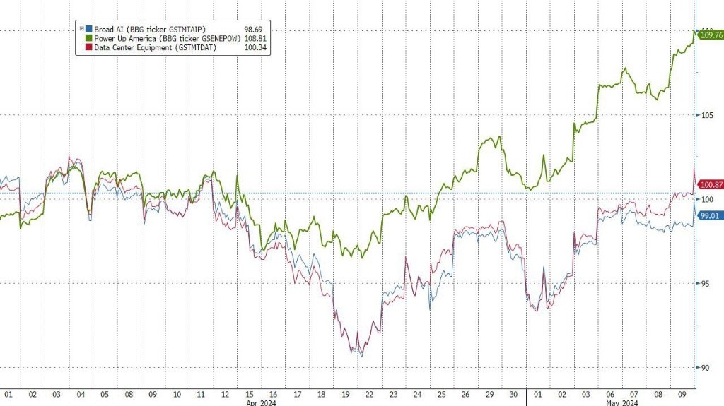 AI 交易仍然炙手可熱,此前有媒體報道稱,由於維持 AI 數據中心運營需要巨量電力,這將成為 “下一個 AI 交易”,高盛為此推出了 “充電美國交易” 指數(Power Up America,GSENEPOW)。而這一交易策略也不負眾望,自出籠以來回報率已經超過美股 “七姐妹”(Magnificent 7)以及 “廣泛 AI” 和 “數據中心” 兩籃子股票。
