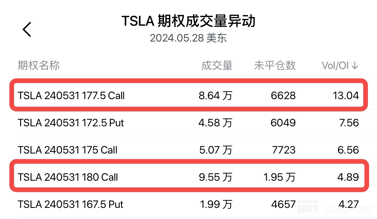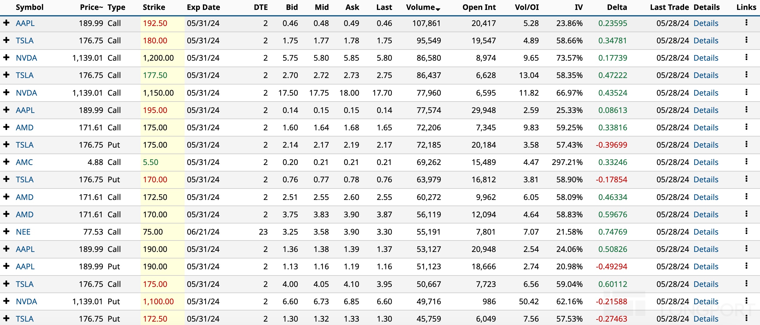 隔夜最火合約:5 月 31 日到期、執行價 192.5 美元的蘋果 call,成交超 10 萬張!執行價 180 美元的特斯拉 call 成交 9.5 萬張。執行價 1200 美元的英偉達 call 成交近 9 萬張。