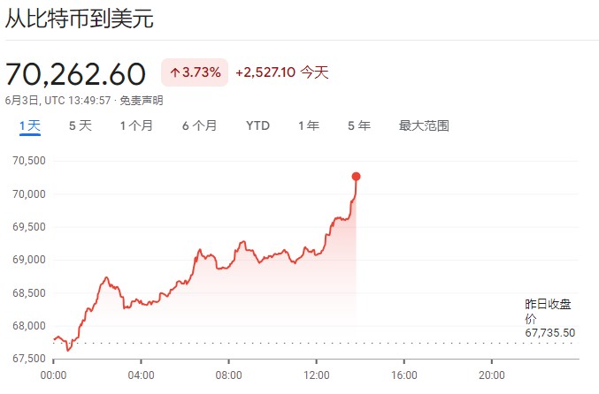 比特幣重新站上 70000 美元/枚,日內漲 3.70%。