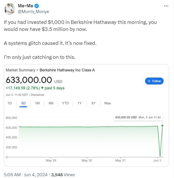 對此,有網友表示:“如果你今天早上在伯克希爾哈撒韋公司投資了 1000 美元,那麼現在你就會擁有 350 萬美元。這是系統故障造成的。現在已經修好了。我剛剛才意識到這一點。”