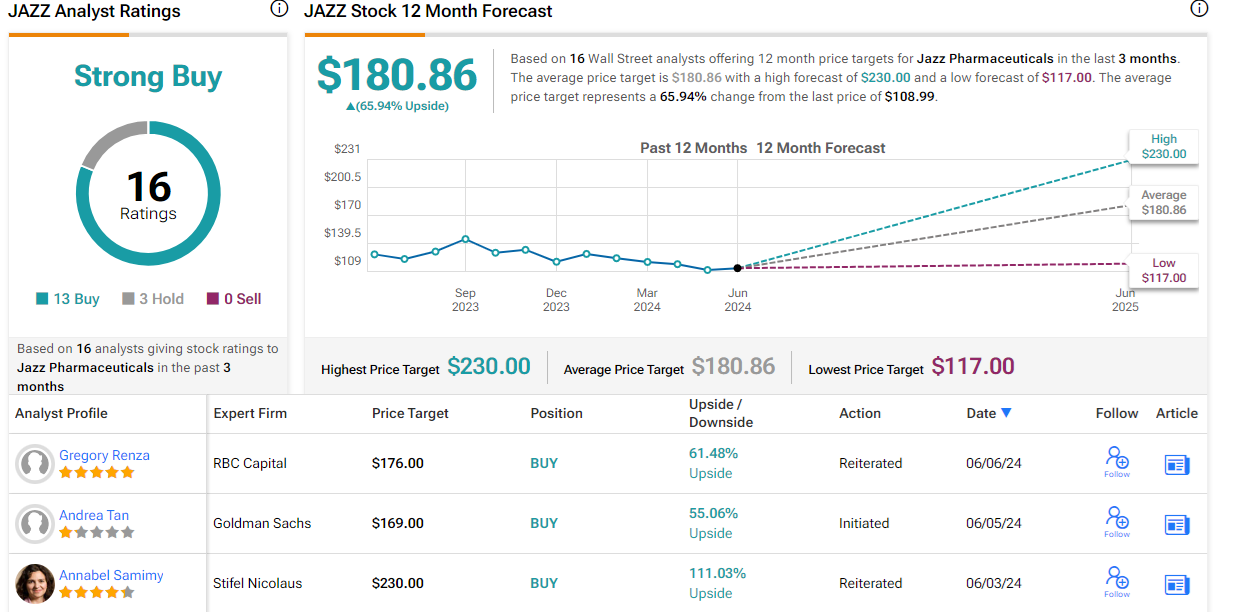 Wall Street analysts' "strong buy" consensus rating on Jazz Pharmaceuticals is based on 16 comments, including 13 "buy" rating reports and 3 "hold" ratings. The stock's average target price of $180.86 is even more optimistic than Goldman Sachs' view, indicating a potential upside of 66% from Monday's closing price of $108.99.