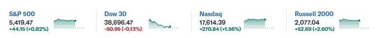 標普 500 指數大盤和科技股居多的納指開盤即創新高,標普漲超 1% 並升破 5400 點,納指漲超 300 點或漲約 2%。道指盤初漲超 370 點或漲約 1%,一度升破 3.9 萬點,午盤前漲幅顯著收窄。