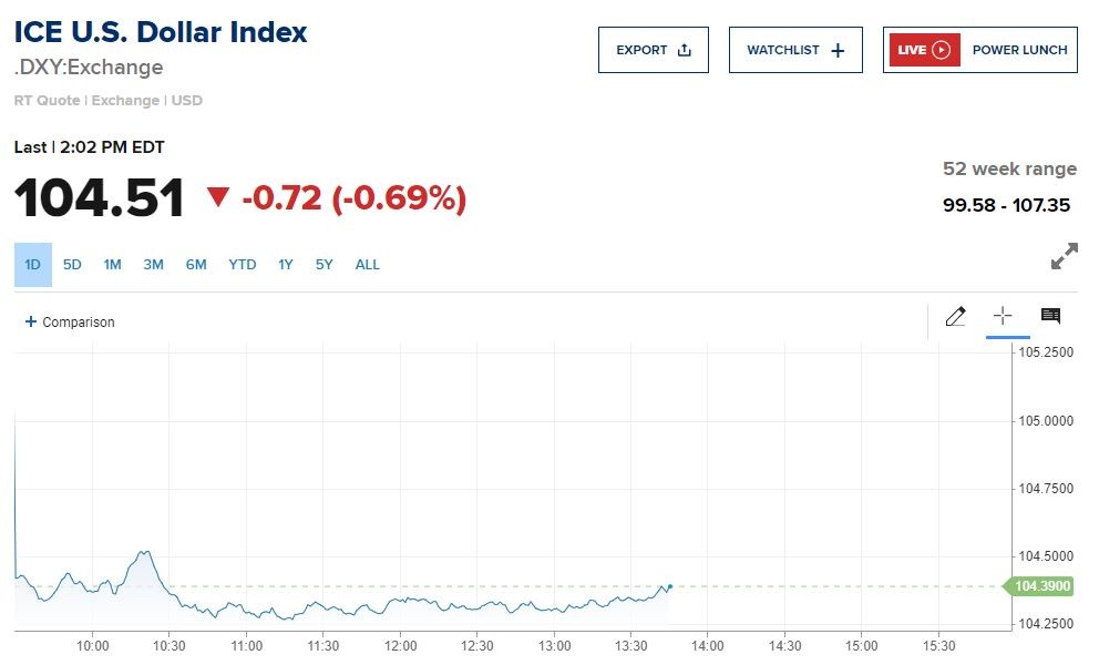 衡量兑六種主要貨幣的一籃子美元指數 DXY 最深跌 0.9% 至 104.26,失守 105 關口,抹去上週五以來絕大部分漲幅,止步三日連漲並脱離四周高位。歐元和英鎊兑美元均漲超百點,日元漲 1%。
