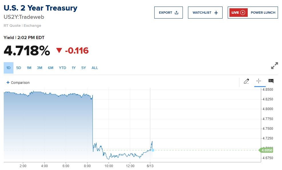 決策公佈前 5分鐘,兩年期美債收益率下行 14 個基點並失守 4.70%,10 年期基債收益率也跌 14 個基點至 4.26%。