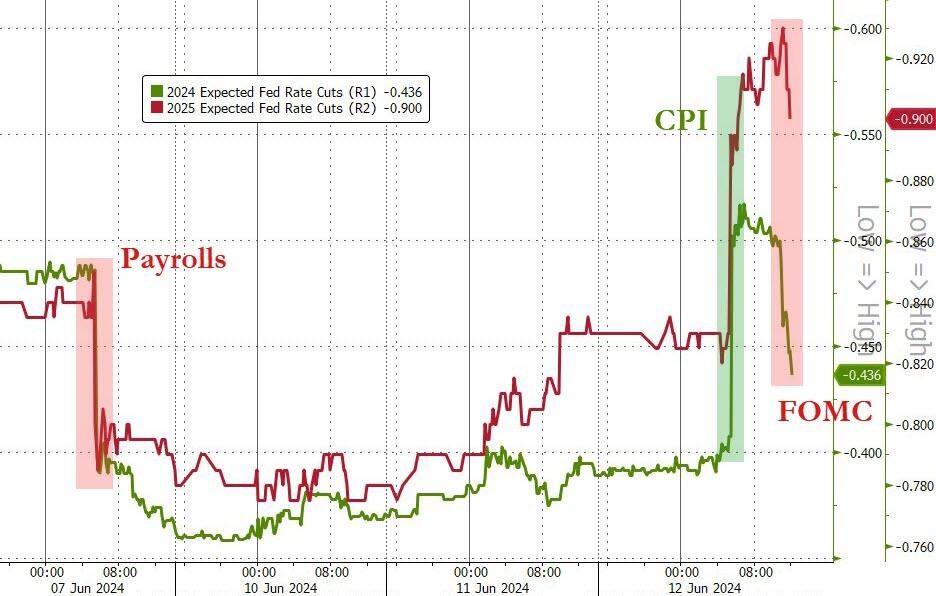 降息預期也上躥下跳,疲軟的 CPI 導致降息預期飆升,但點陣圖引發逆轉,主要是 2024 年的預期。