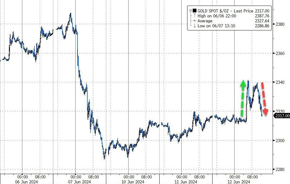 黃金走出先漲後跌趨勢,CPI 公佈後現貨黃金一度拉昇 30 美元,鮑威爾發言時回落至 2320 美元下方,最終收盤持平。