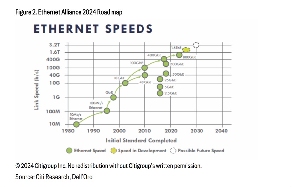 花旗報告指出,英偉達和 Arista Networks 都將在 2024 年底或 2025 年初擁有端到端的 800G 解決方案: