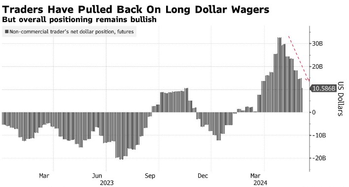 非商業交易員——包括資產管理公司、對沖基金和其他投機性市場參與者——自 4 月份看漲美元的短期峯值以來,已削減了逾三分之二的美元多頭頭寸。他們目前持有約 106 億美元與美元走強相關的押注,為 3 月中旬以來的最低水平。