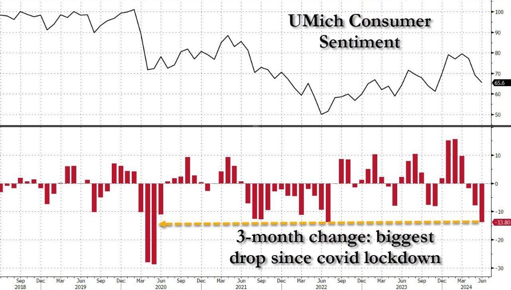 美國 6 月密歇根大學消費者信心指數初值 65.6,大幅不及預期的 72,5 月前值為 69.1。上個月公佈的數據顯示,美國 5 月密歇根大學消費者信心指數終值位於六個月低點,較 4 月暴跌。