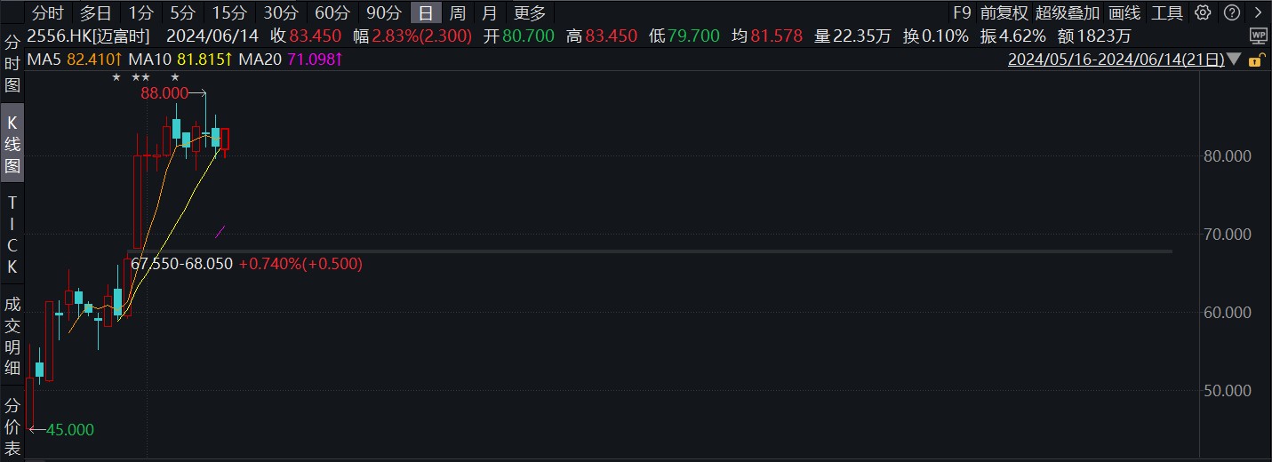 智通財經 APP 觀察到,有國內營銷及銷售 SaaS 龍頭之稱的邁富時 (02556) 於今年 5 月 16 日正式於港股主板掛牌上市,其發行價為 43.6 港元,上市首日大漲超 18%,此後該公司股價一路上漲,至 6 月 12 日最高漲至 88 港元。