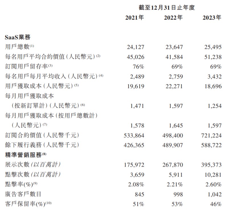 2021-2023 年,邁富時 SaaS 業務的用户數目分別達到 24127 名、23647 名及 25495 名 (2022 年的下滑是受疫情的影響),每名用户平均合約價值分別為 45026 元 (人民幣,下同)、41584 元及 51238 元。