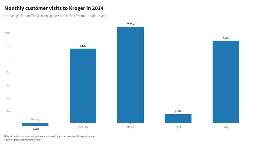 根據顧客位置以及客流量分析公司 Placer.ai 的最新數據,今年 2 月至 5 月期間,克羅格的客户訪問量平均基準之下同比增長 5.1%。