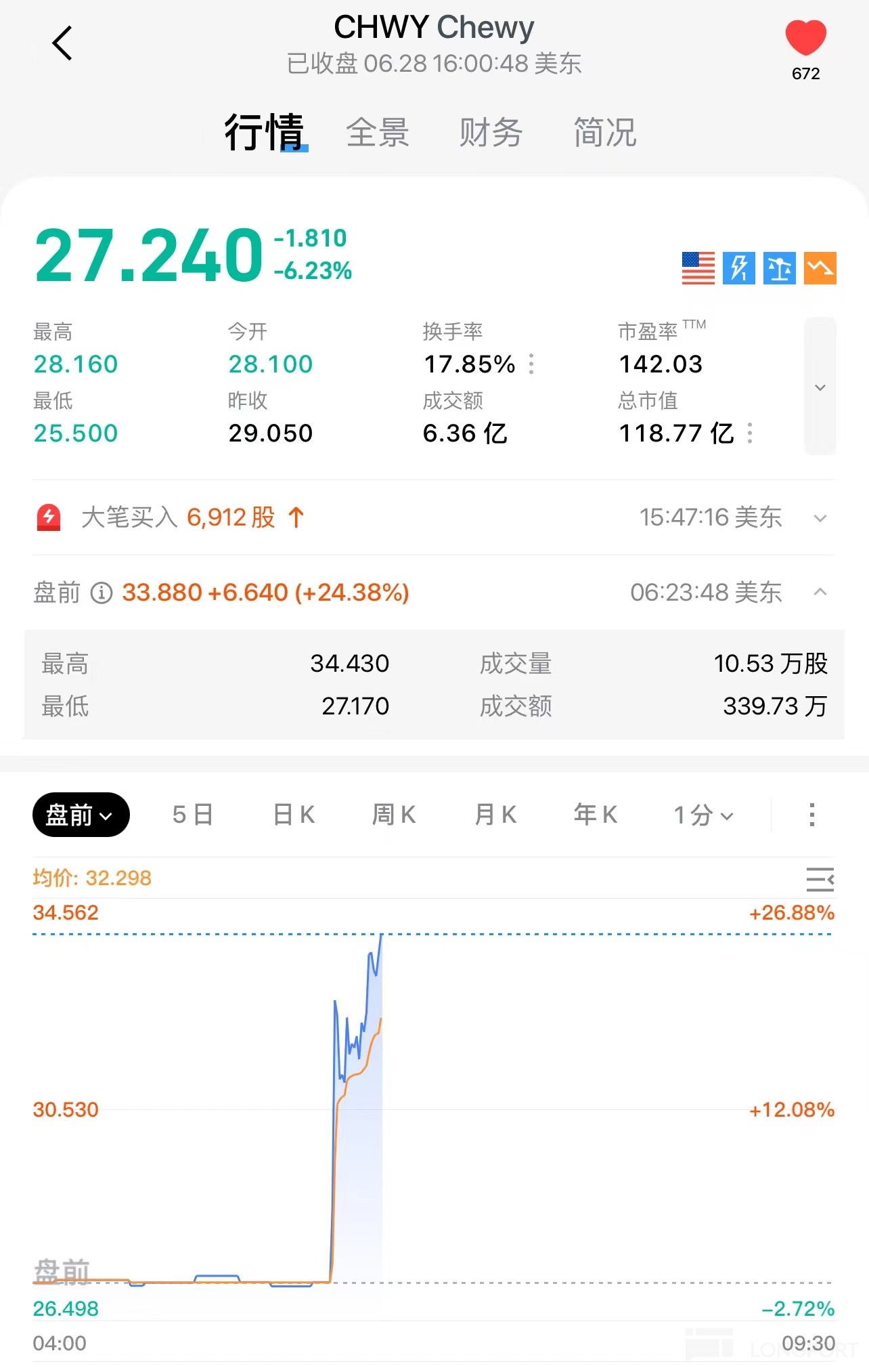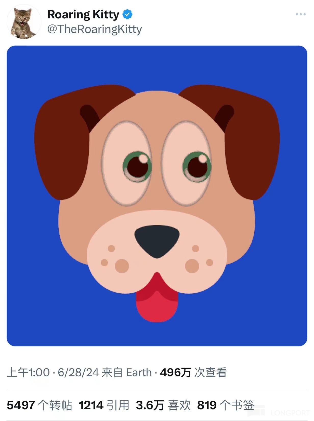 6 月 28 日,Roaring Kitty 發了一張寵物狗的頭像,當天 Chewy 股價一度大漲 28%,不過當天跌去全部漲幅,第二天繼續下跌超 6%。