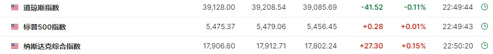科技股為主的納指低開 71 點後,開盤不到半小時轉漲,漲幅曾擴大近 0.19%。標普 500 大盤低開 13 點後,抹平跌幅,多次短線轉漲,圍繞 0% 小幅震盪;藍籌股匯聚的道指低開 61 點後,雖開盤半小時內轉漲並漲超 0.1%,後仍然維持跌勢。