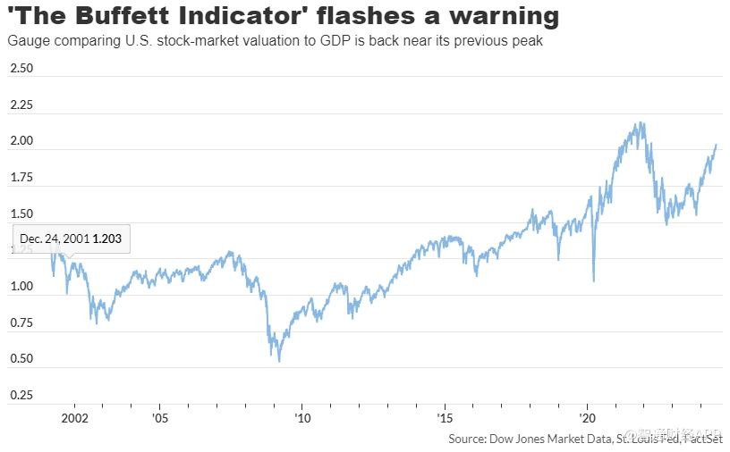 一位對沖基金創始人認為,這一指標發出的信息非常明確,即美股看起來非常昂貴。巴菲特指標是 “將所有交易活躍的美國股票的總市值除以最新季度國內生產總值 (GDP) 的估計值”。早在 2001 年,巴菲特表示,這 “可能是任何時候衡量估值狀況的最佳單一指標”。