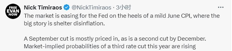 有 “新美聯儲通訊社” 之稱的知名財經記者 Nick Timiraos 很快對 6 月 CPI 數據發表評論。他在社交媒體發帖稱,6 月 CPI 增長温和的主要原因是住房相關通脹下降,市場對美聯儲降息感到放心,9 月降息的預期大部分已經反映在價格中,12 月第二次降息的預期也是如此。市場暗示今年第三次降息的可能性正在增加。