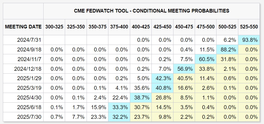 有分析認為,美聯儲將在 7 月政策聲明中釋放更加明確的降息信號,為 9 月進行年內首次降息奠定基礎。芝商所 FedWatch 工具顯示,7 月降息 25 基點的概率不到 7%,而 9 月降息的概率高達 90%。