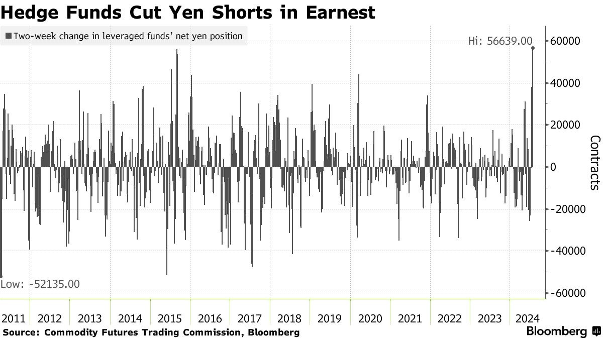 智通財經 APP 獲悉,隨着一度備受投資者追捧的套利交易崩盤,對沖基金匆忙撤出日元空頭頭寸。美國商品期貨交易委員會 (CFTC) 的數據顯示,在截至 7 月 23 日的兩週內,對沖基金淨減少了 56,639 份日元空頭頭寸,這是自 2011 年初以來最大規模的一次拋售。