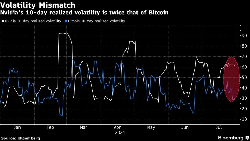 智通財經獲悉,英偉達 (NVDA.US) 最近的股價走勢逆轉凸顯出一種風險——從一項關鍵指標來看,英偉達的波動性大約是比特幣的兩倍。在英偉達股價只漲不跌的情況下,這種風險並不重要;但在大幅波動的情況下,最近英偉達股價下跌意味着股價走向了一個可能表明其有進一步下跌空間的門檻。