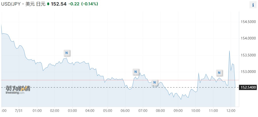 日本央行的漸進做法與美聯儲 2022 年的快速緊縮形成了對比,後者在 2022 年至 2023 年期間將政策利率提高了 5.25 個百分點。巨大的利差導致資金從日本流向美國,導致日元持續下跌;日元兑美元匯率本月接近 162,創 37 年新低,自 2022 年初以來下跌了近 30%。消息發佈後,日元匯率短線劇烈震盪走高,美元兑日元目前跌破 153,稍早一度快速跌破 152 關口。